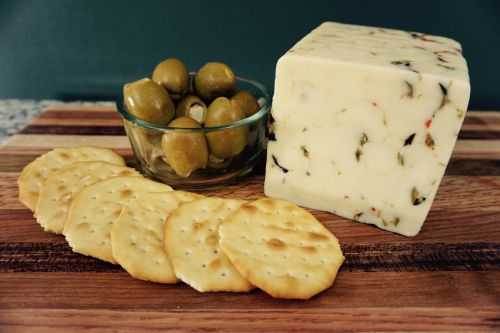 1 lb. A mild white cheddar with black and green olives with pimentos added.